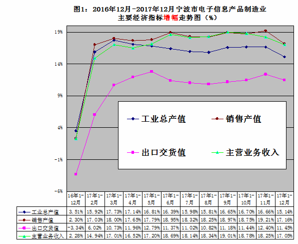 2017年全市电子信息制造业深入贯彻落实“中国制造2025”、“互联网+”等国家发展战略,以智能经济发展为引领,大力推进产业结构调整和智能化升级,全行业经济运行呈现良好态势。