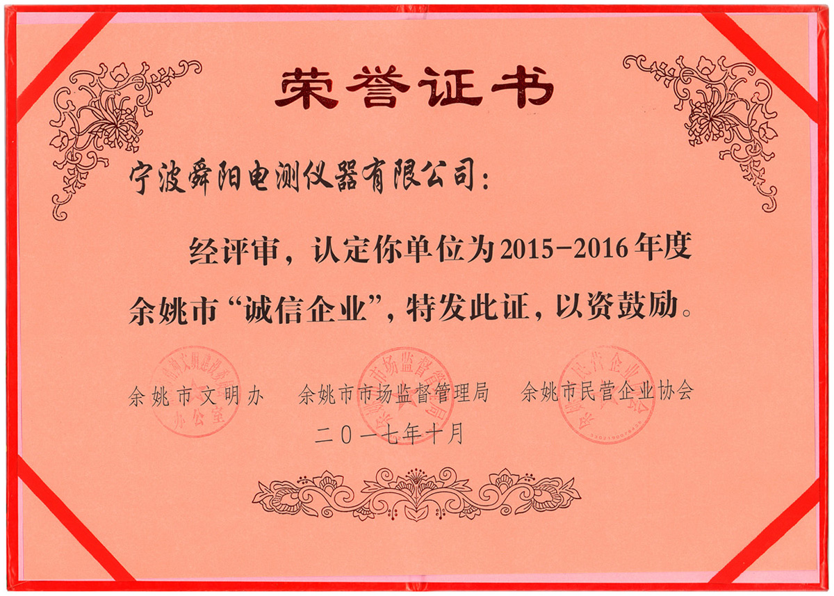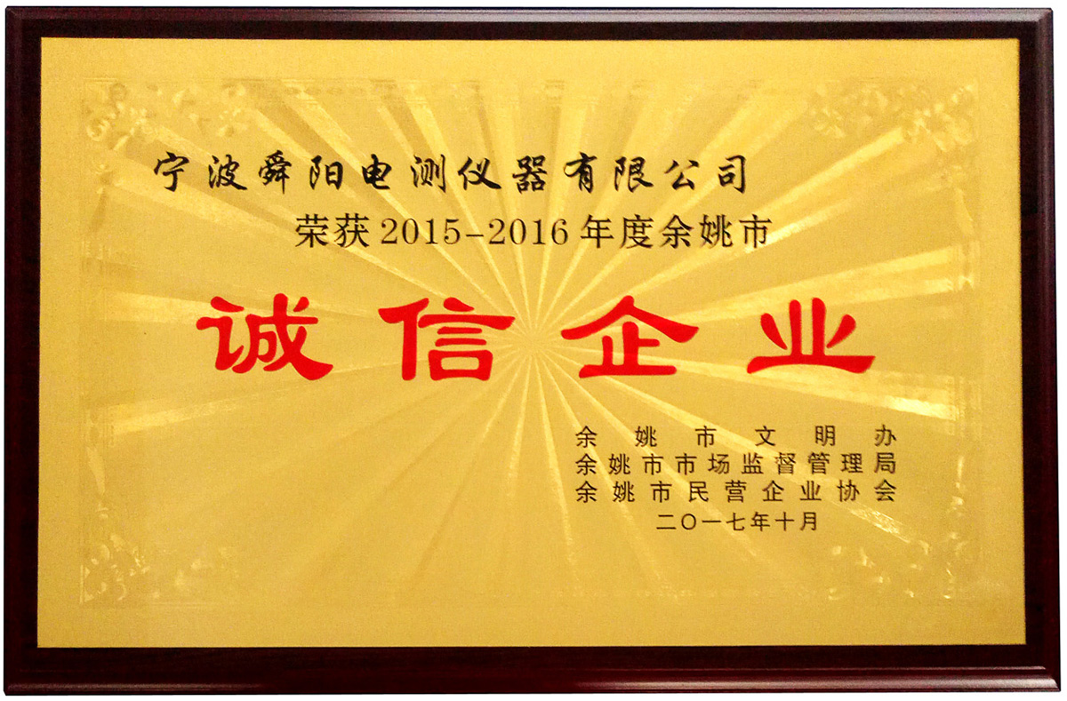 刚刚捧回铜匾,我们宁波舜阳电测仪器有限公司已被市文明办、市市场监督管理局、市民营企业协会等部门认定为2015-2016年度余姚市诚信民营企业。是我公司自2003年以来第六次获得的这一荣誉,将进一步激发全体员工进取心。