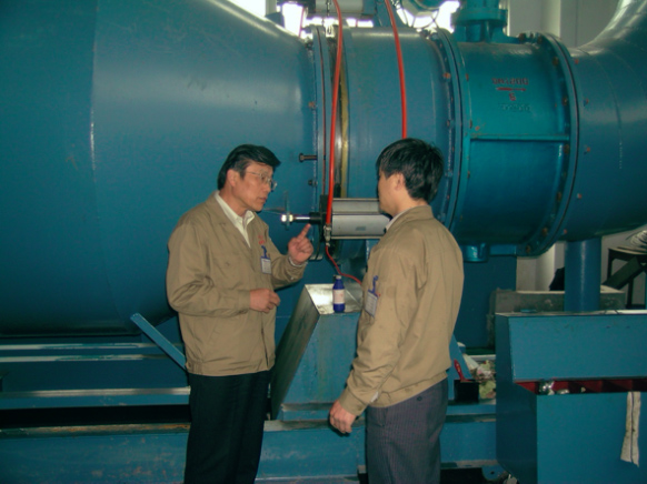 2006年在余姚银环流量仪表公司,朱家顺(左)在与技术人员交流,旁边即是由他设计的DN2200水流量标准装置
