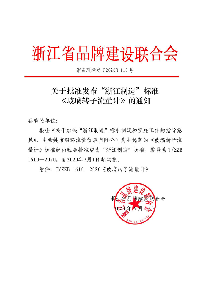 附:《关于批准发布“浙江制造”标准<玻璃转子流量计>的通知》