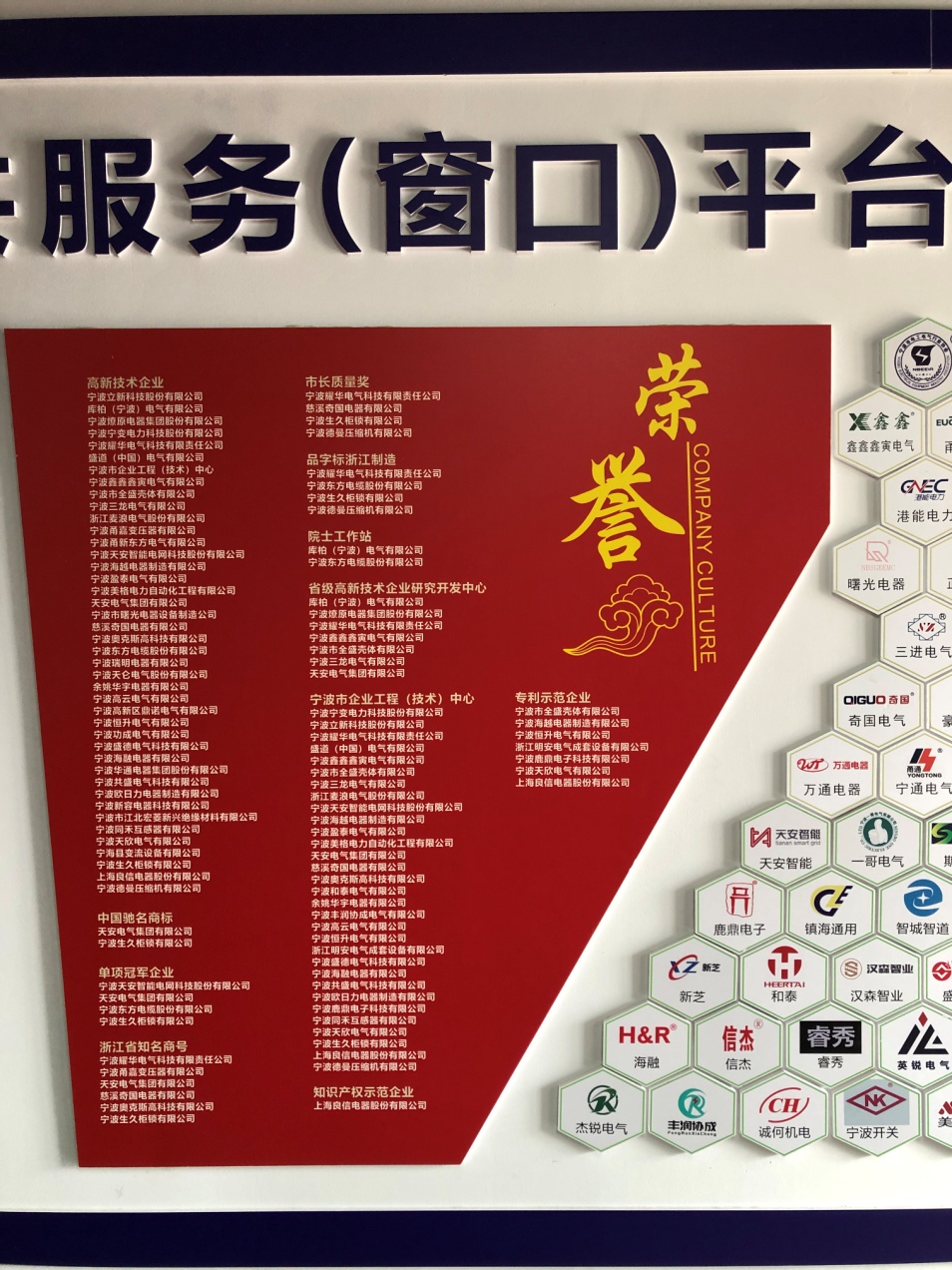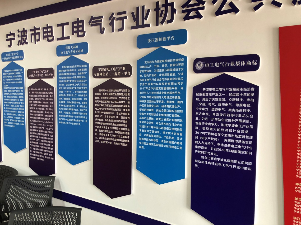 协会联合政府相关职能部门、国家级学(协)会等创建了一系列服务平台:中国电器工业协会直属理事单位、中国电工技术学会宁波服务站、“科创中国 •宁波 ”电工电气产业创新服务中心、宁波市科学技术协会团体会员单位、宁波市科技大市场电工电气专业分市场运营单位、中国国际贸易促进委员会宁波市电工电气行业委员会、宁波市电工电气行业协会品牌指导服务站(市市场监管局认定)、宁波市电工电气行业协会中小企业公共服务平台(市经信局认定)、宁波市电工电气行业协会专家委员会。